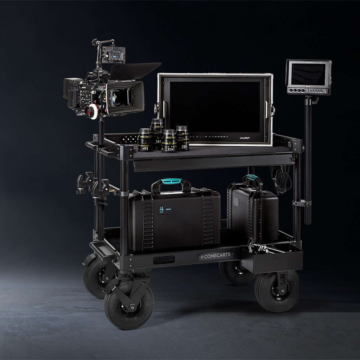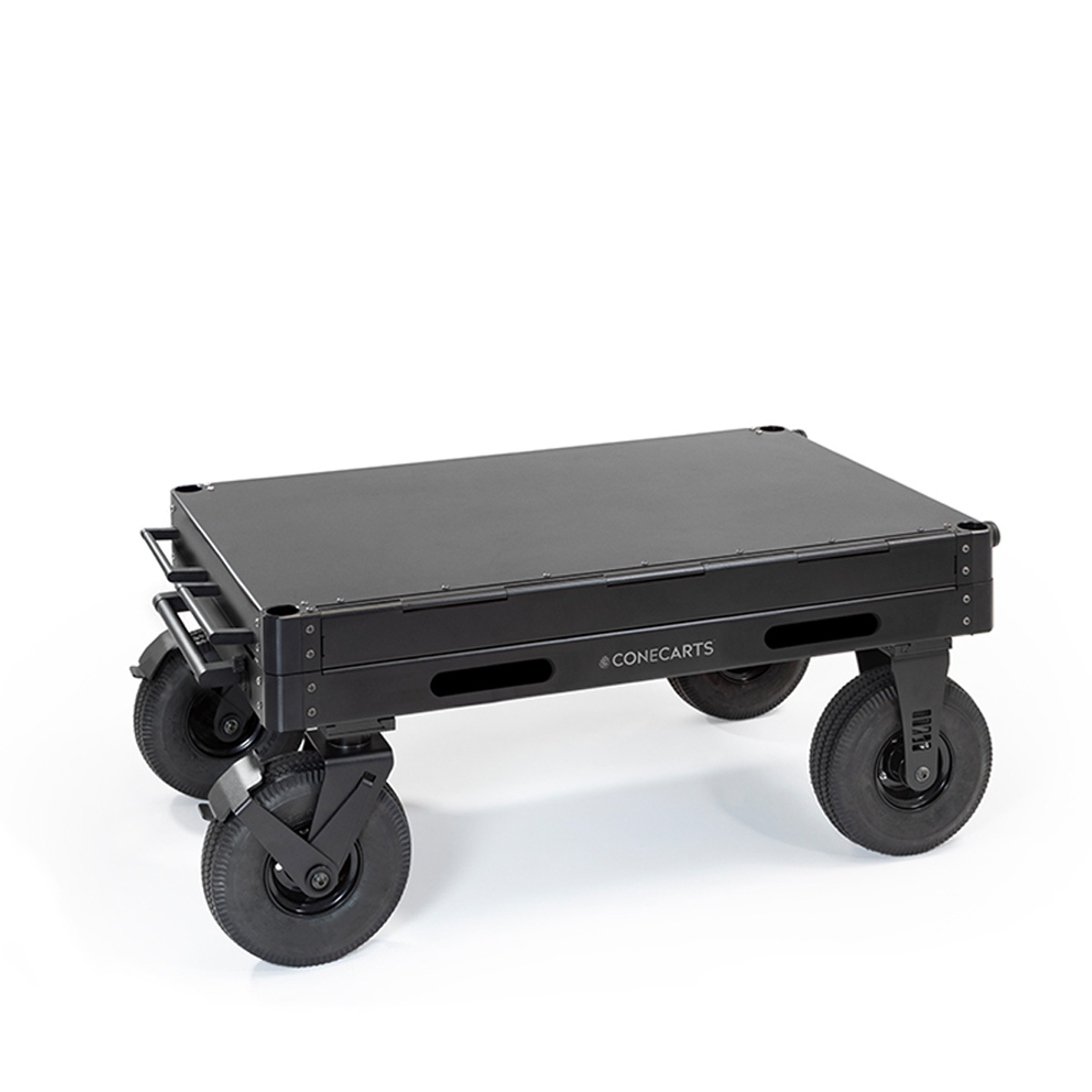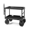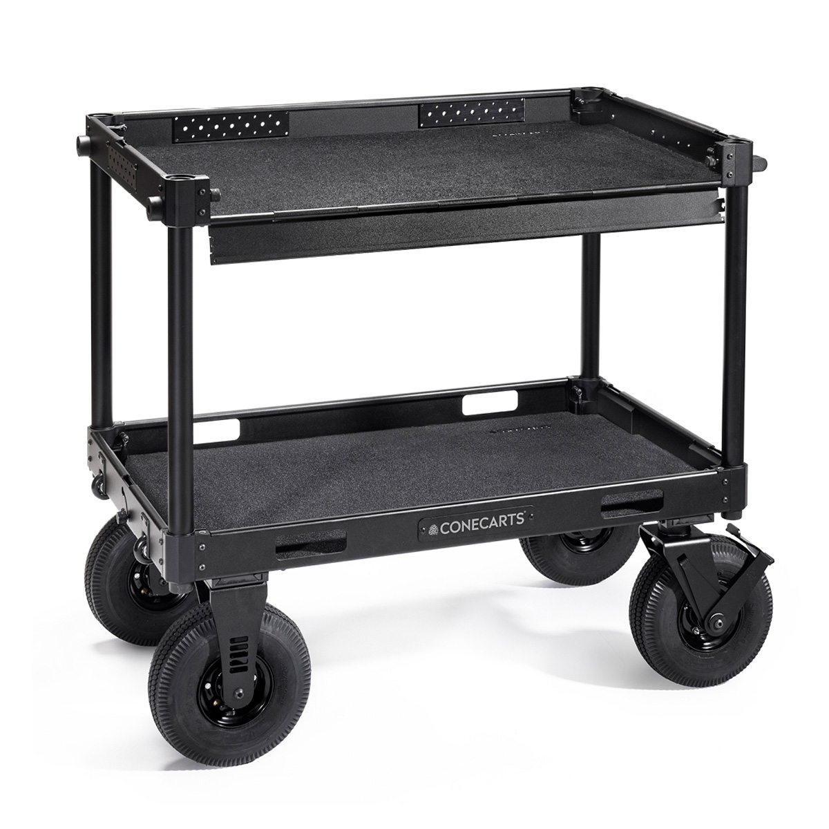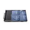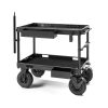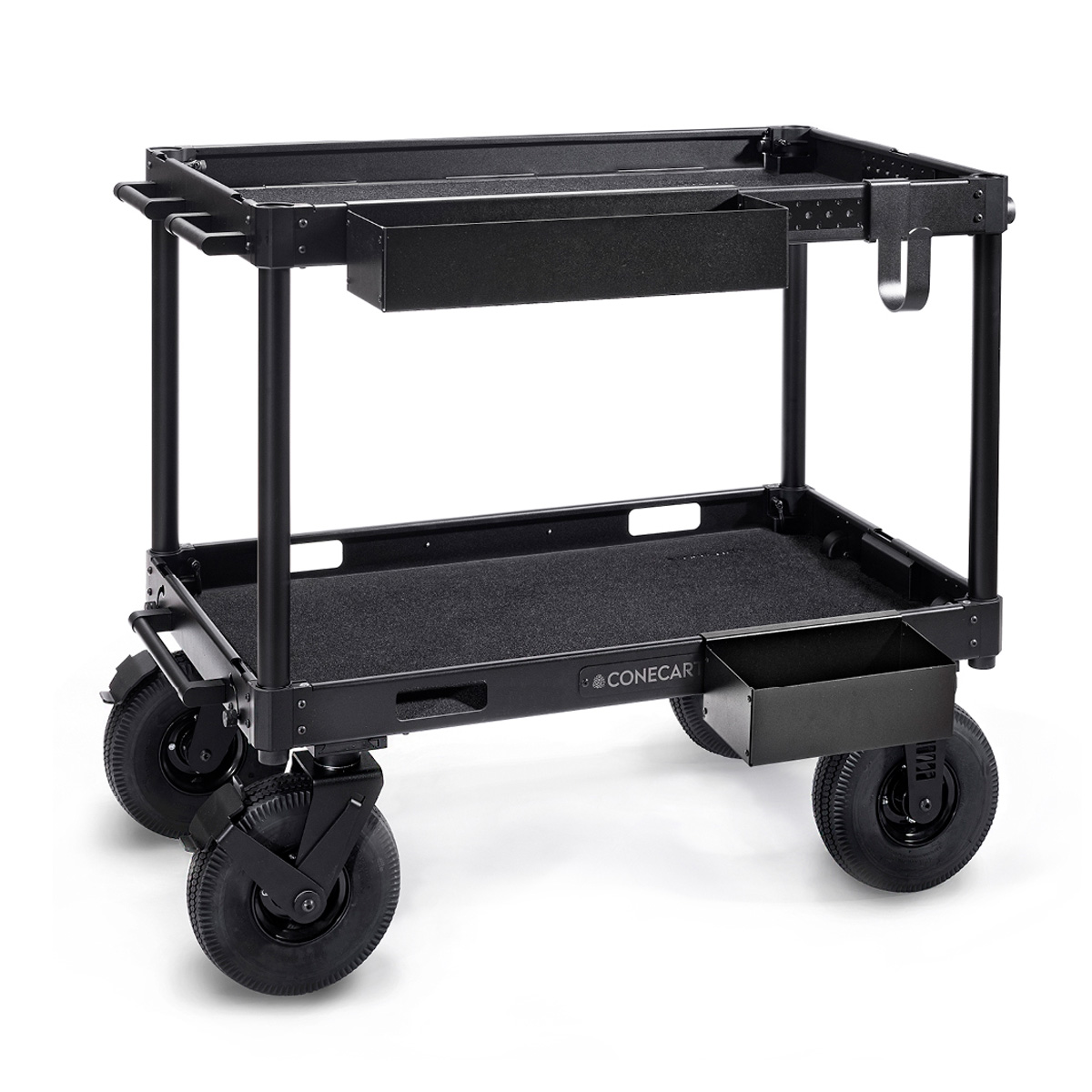 ConeCarts Rocket is an aluminum cart that, when collapsed, can be moved like a trolley. The cart is compact when collapsed and can be stored anywhere, even in tight spaces. Rocket’s lateral drop-down lid allows you to quickly and easily transform it into a work station. Each shelf has a black fabric mat which guarantees greater protection of the cart and tools. The following accessories can also be purchased separately:- LARGE side tray