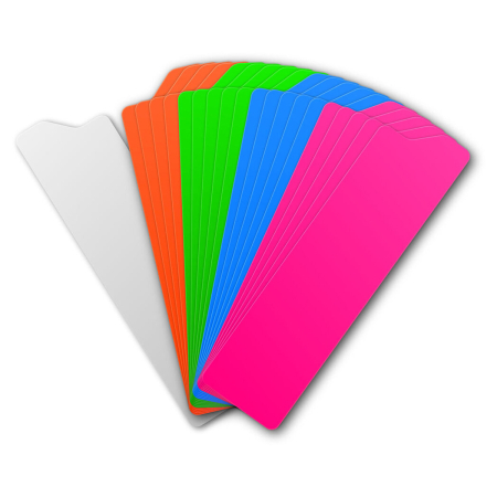 Set obsahuje 20 pevných kartiček vyrobených z kvalitního kartonu, navržených přesně pro vložení do pouzder CRDPOUCH se štítkovacím okénkem (label window). Kartičky v rozměru 119 × 32 mm poskytují dostatečnou plochu pro čitelné popisky, čísla scén, časové kódy, jména herců nebo technické poznámky. Barevné rozlišení (oranžová, zelená, modrá, růžová) optimalizuje rychlou vizuální identifikaci při práci na place: barevné kategorie lze přiřadit k typům záběrů, lokacím, denním a nočním štábům nebo prioritám.