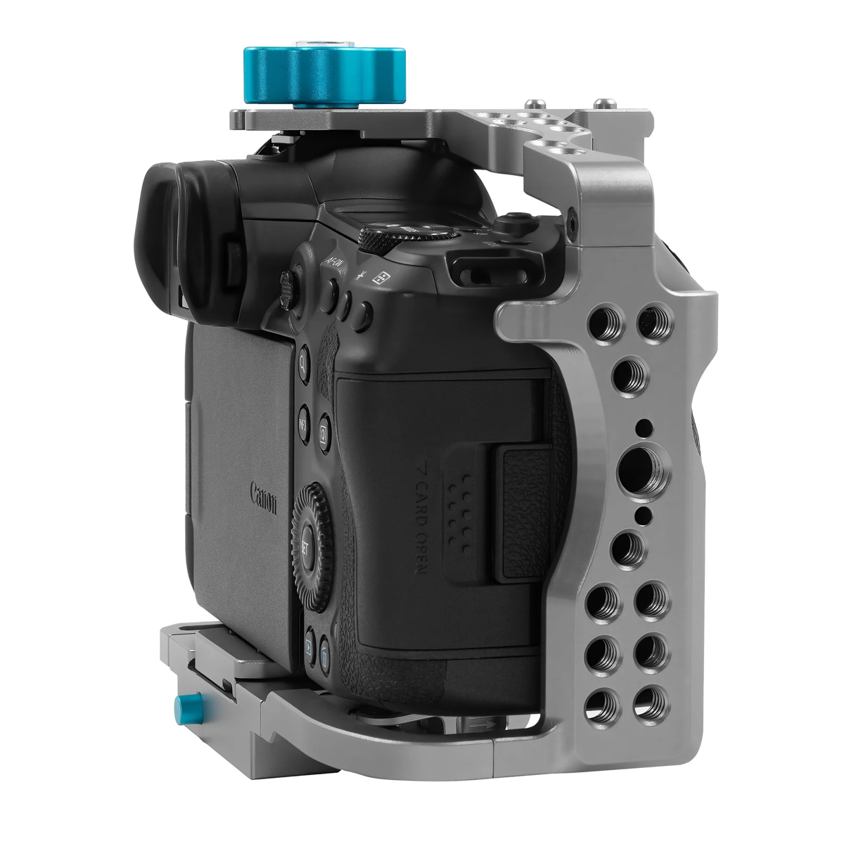 Kondor Blue Arca Cage pro Canon R5/R6/R poskytuje pevnou ochranu těla, Arca‑Swiss kompatibilitu a množství montážních závitů pro příslušenství; lehká hliníková konstrukce a ergonomický grip zvyšují komfort při natáčení a fotografování.