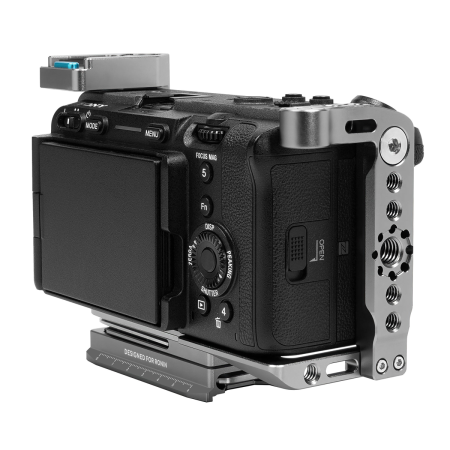Kondor Blue cage je vyroben z lehké, avšak pevné slitiny (hliník/kovové komponenty), navržen tak, aby pevně obepínal tělo Sony FX3/FX30 bez omezení přístupu k ovládacím prvkům, bateriovému prostoru a konektorům. Pevné upnutí minimalizuje vůli a zajišťuje konzistentní polohu kamery při použití stabilizačních systémů a gimbalů. Robustní design poskytuje mechanickou ochranu v terénu i ve studiu.