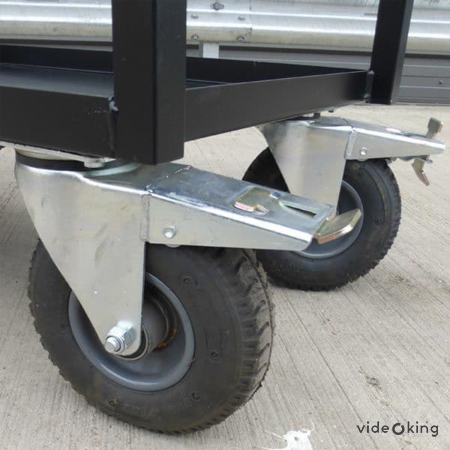 – Mobilita a bezpečnost: Těžké průmyslové kolečka s brzdami (zamykatelné kolečky) umožňují hladké přemisťování i po nerovném terénu studií, zatímco brzdy zajišťují stabilitu při umístění vozíku vedle scény.