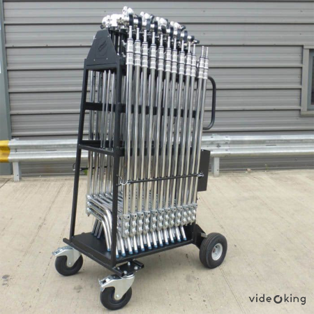 Vozík pojme až 24 C-standů, což umožňuje centralizované uskladnění více sad bez rizika poškození nohou nebo hlavic. Rozmístění držáků zajišťuje pevné uchycení jednotlivých stojanů a minimalizuje riziko vzájemného poškrábání při dojezdu.