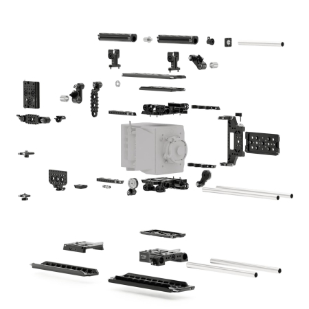 – Obsah sady: hlavní cage rám, spodní baseplate s ARRI rozetou, top handle, side handles, 15mm rod set, cheese plates pro umístění příslušenství, montážní šrouby a kabelové svorky (konkrétní obsah se může lišit podle verze).