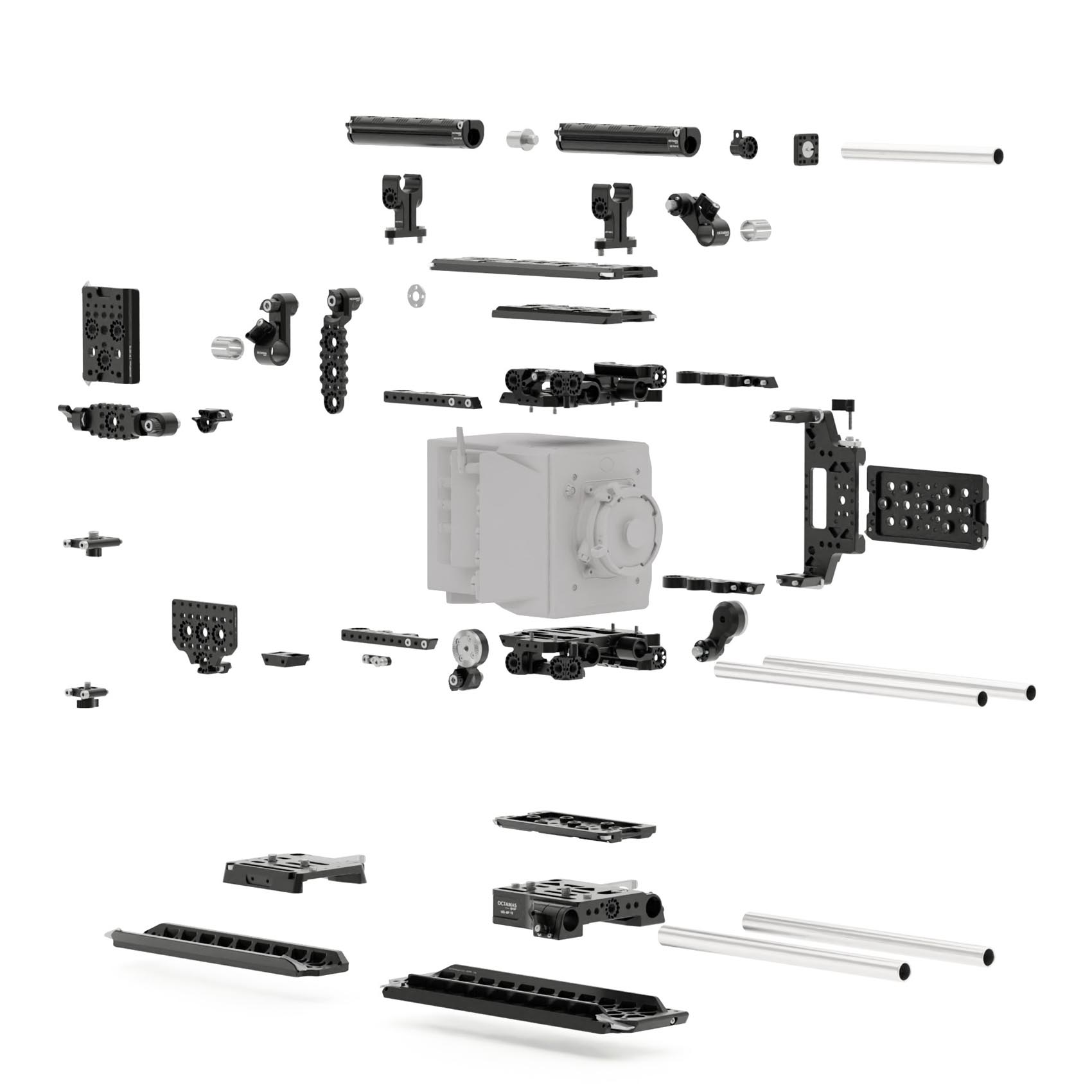 Full Set poskytuje kompletní sadu komponentů, které splňují průmyslové standardy a usnadňují práci kameramanů i techniků. Konstrukce vychází z CNC obráběného hliníku s anodizovanou povrchovou úpravou pro vyšší odolnost proti opotřebení a častému nasazení. Standardní ARRI rosetta a 15mm tyčový systém zajišťují kompatibilitu s širokou škálou follow focusů, matte boxů a dalších příslušenství, což umožňuje rychlé přepínání mezi run-and-gun konfigurací a plně vybaveným rigem pro komerční či kinoprodukce. Součástí sady jsou cage (ochranný rám) a ergonomický top handle, které zvyšují manipulaci s kamerou při handheld záběrech, zatímco boční rukojeti (side handles) poskytují lepší kontrolu a komfort při dlouhých natáčecích dnech. Set obsahuje rovněž základní baseplate s 15mm rod support a různé cheese plates pro flexibilní montáž monitorů, záznamníků a dalších doplňků. Praktické doplňky jako montážní šrouby a kabelové svorky zjednodušují instalaci a správu kabeláže na place, přičemž konfigurace umožňuje plný přístup ke konektorům SDI, HDMI, XLR a napájení bez nutnosti demontáže krytů, což urychluje připojení externích zařízení a napájení .