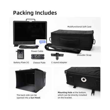Tělo monitoru je koncipováno pro náročné použití v terénu, s možností připevnění na rameno, rig či stativ. V-Mount držák zajišťuje kompatibilitu s profesionálními bateriemi pro dlouhý provoz bez přerušení. Možnosti D-Tap nebo XLR napájení poskytují flexibilitu pro různé produkční zařízení.