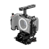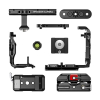 Modulární systém obsahuje top plate a L‑bracket, ergonomický cage grip a odnímatelný top handle pro pohodlné přenášení a stabilní držení při dlouhých záběrech. Integrovaná LW 15 mm baseplate (15mm low‑weight/low‑profile) podporuje follow focus systémy, matte boxy a další 15 mm příslušenství, čímž umožňuje rychlé nasazení filmových kontrolních prvků na objektivu. Arca‑type adaptér a Arca‑kompatibilní dovetail usnadňují rychlé upínání na stativové hlavice a gimbaly, přičemž nízké těžiště podporuje stabilitu těžiště při použití gimbalu nebo ramenního riggování .